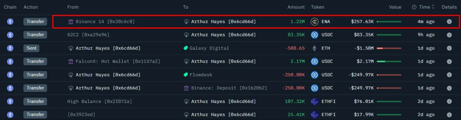 BitMEX co-founder Arthur Hayes has withdrawn 1.22 million ENA, worth approximately $257,000, from Binance, Onchain-Lenz reported.