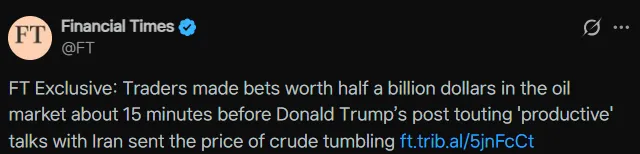 A massive $580 million options trade occurred in the oil market just before U.S. President Donald Trump posted on social media suggesting possible negotiations with Iran, the Financial Times (FT) reported. Just prior to Trump's post, 6,200 contracts related to Brent and West Texas Intermediate (WTI) crude were traded, while S&P 500 futures with a notional value of $1.5 billion were also executed at the same time. The FT noted that the market is focused on the timing of the large capital movement, which coincided precisely with the president's official statement, raising suspicions of a potential information leak or preemptive action. After Trump's post, oil prices saw sharp volatility, and the traders who bet on the oil-related options could have made over $100 million in profit in about 20 minutes, the outlet explained.