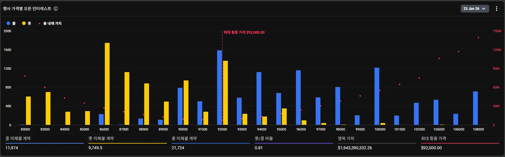 According to data from crypto options exchange Deribit, Bitcoin options with a notional value of $1.9 billion are set to expire at 8:00 a.m. UTC on Jan. 23. These contracts have a put/call ratio of 0.81 and a max pain price of $92,000. Additionally, Ethereum options worth $347 million will expire at the same time, featuring a put/call ratio of 0.84 and a max pain price of $3,200.