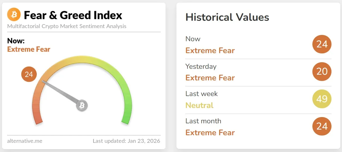 The Crypto Fear & Greed Index rose four points from the previous day to 24, though it remains in the extreme fear category, according to data from Alternative. The index measures market sentiment on a scale of 0 (extreme fear) to 100 (extreme optimism). It is calculated based on volatility (25%), trading volume (25%), social media mentions (15%), surveys (15%), Bitcoin's market cap dominance (10%), and Google search volume (10%).