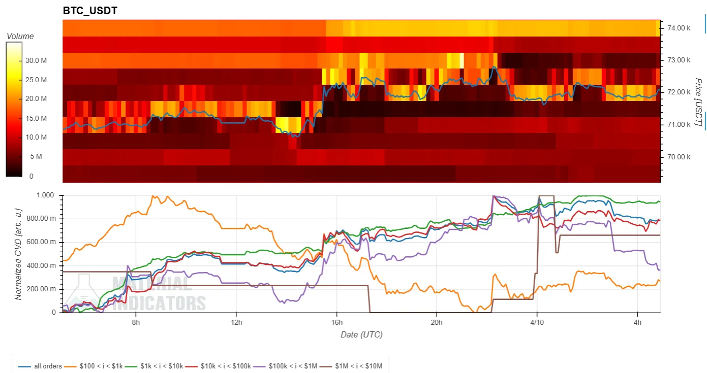 The Spot CVD chart analyzes the order book for the BTC/USDT spot trading pair. The top section shows a volume heatmap, while the bottom displays the Cumulative Volume Delta (CVD). - The volume heatmap tracks trading volume at specific price levels. The background color brightens when the price remains in a certain range for an extended period or experiences a significant move. Brighter areas may indicate potential support or resistance levels. - The CVD indicator breaks down buy and sell orders by trade size. A rise in a colored line indicates an increase in buy orders within that size bracket. For example, the yellow line represents orders between $100 and $1,000, while the brown line tracks large orders from $1 million to $10 million.