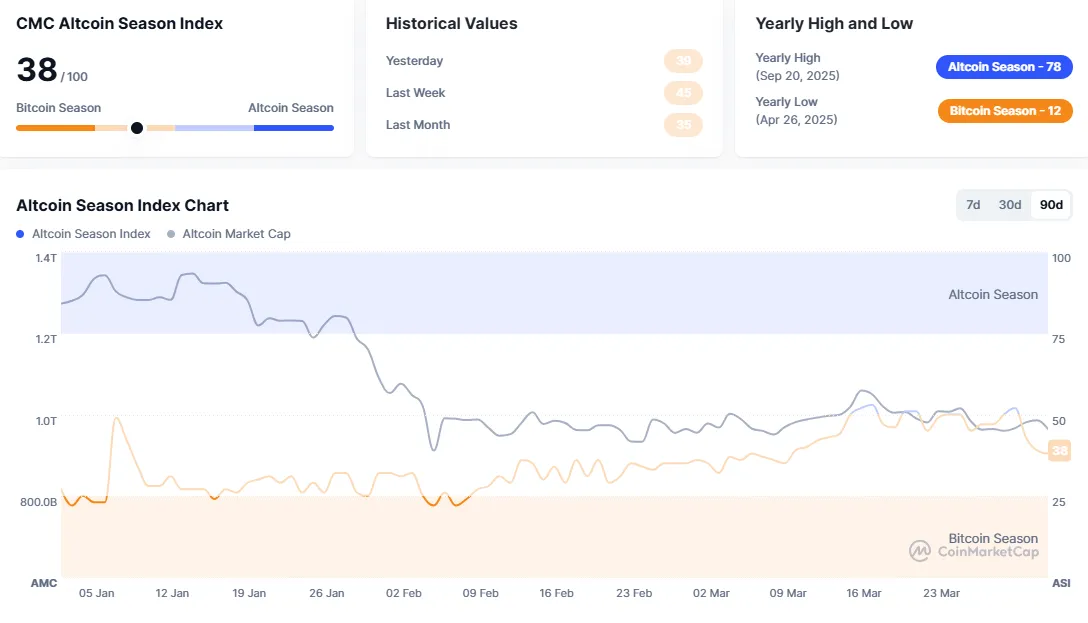 CoinMarketCap's Altcoin Season Index has dropped six points from yesterday to 38. The index compares the price performance of the top 100 coins by market capitalization (excluding stablecoins and wrapped coins) against Bitcoin. If 75% of these coins outperform Bitcoin over the past 90 days, it is considered an altcoin season. Otherwise, it is deemed a Bitcoin season. A score closer to 100 indicates an altcoin season.