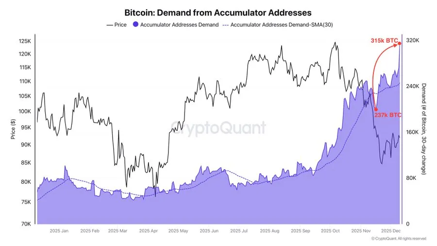 Bitcoin accumulation addresses, defined as wallets holding for the long term, added 75,000 BTC between Dec. 1 and Dec. 10, according to an analysis by CryptoQuant contributor DarkPost on X. DarkPost noted that 40,000 BTC of this total was purchased between Dec. 9 and Dec. 10 alone. These addresses now hold approximately 315,000 BTC, and the accumulation trend is continuing. The analysis classifies these addresses based on criteria including no withdrawal history and repeated deposits, while excluding wallets tied to exchanges, miners, or smart contracts.