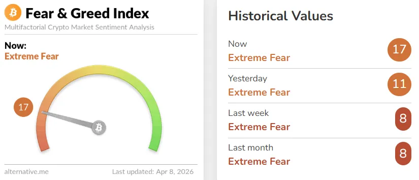 The Crypto Fear & Greed Index, compiled by data provider Alternative, has risen six points from the previous day to 17, though market sentiment remains in a state of extreme fear. The index measures market sentiment on a scale from 0 (extreme fear) to 100 (extreme optimism). It is calculated based on several factors: volatility (25%), trading volume (25%), social media mentions (15%), surveys (15%), Bitcoin's market cap dominance (10%), and Google search volume (10%).