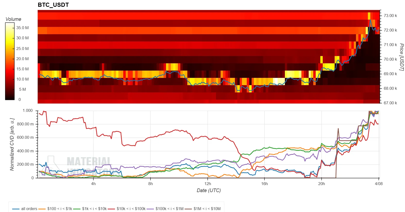 - The CVD indicator at the bottom represents buy and sell orders categorized by size. As buy orders increase, the corresponding colored line rises. The yellow line tracks orders between $100 and $1,000, while the brown line represents large orders from $1 million to $10 million.