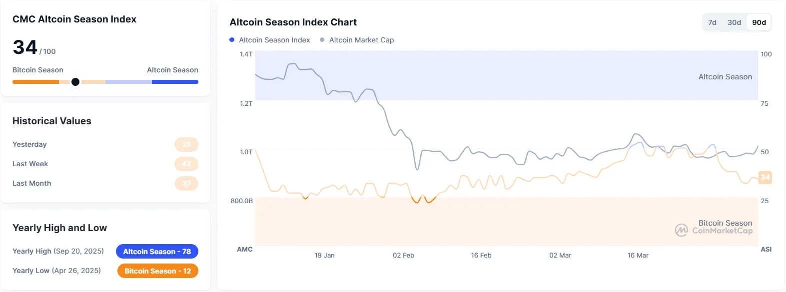 CoinMarketCap's Altcoin Season Index has risen by two points to 34 from yesterday. The index is calculated by comparing the price performance of the top 100 coins, excluding stablecoins and wrapped tokens, against Bitcoin over the last 90 days. An altcoin season is declared when 75% of these top coins outperform Bitcoin during that period, while the opposite is considered a Bitcoin season. A score closer to 100 signals a stronger altcoin season.