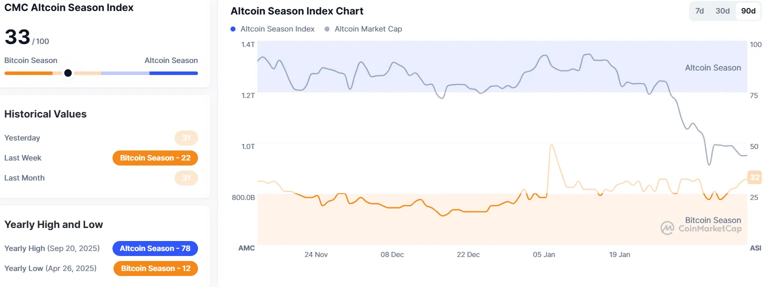 CoinMarketCap's Altcoin Season Index has risen five points from the previous day to 33. The index is calculated by comparing the price performance of the top 100 cryptocurrencies by market capitalization, excluding stablecoins and wrapped coins, against that of Bitcoin. An altcoin season is declared when 75% of these top coins outperform Bitcoin over a 90-day period. A score closer to 100 indicates a stronger altcoin season.