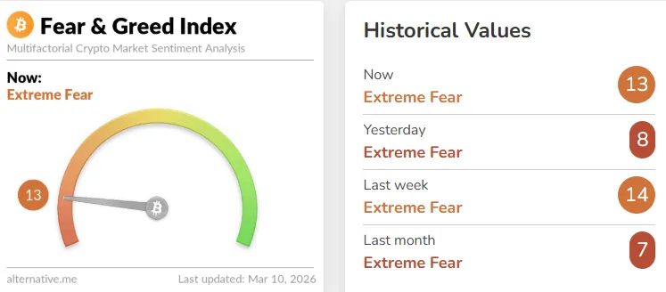 The Fear & Greed Index from crypto data provider Alternative rose five points from yesterday to 13. The index shifted from the 'Fear' to the 'Extreme Fear' category on Jan. 30 and has remained there since. The index indicates extreme fear in the market as it approaches zero and extreme optimism as it approaches 100. The Fear & Greed Index is calculated based on volatility (25%), trading volume (25%), social media mentions (15%), surveys (15%), Bitcoin's market cap dominance (10%), and Google search volume (10%).