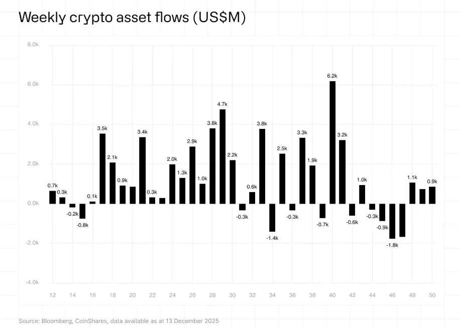 Digital asset investment products saw net inflows of $864 million last week, marking the third consecutive week of positive flows, CoinShares reported in its weekly fund flow report. Bitcoin investment products attracted $522 million, while Ethereum products saw inflows of $338 million. CoinShares explained that although the inflow volume has been modest for three weeks, it appears to reflect an investment base that is becoming cautiously more optimistic. The firm noted that despite a recent interest rate cut by the U.S. Federal Reserve, investor sentiment was mixed and fund flows were erratic in the trading days immediately following the move.