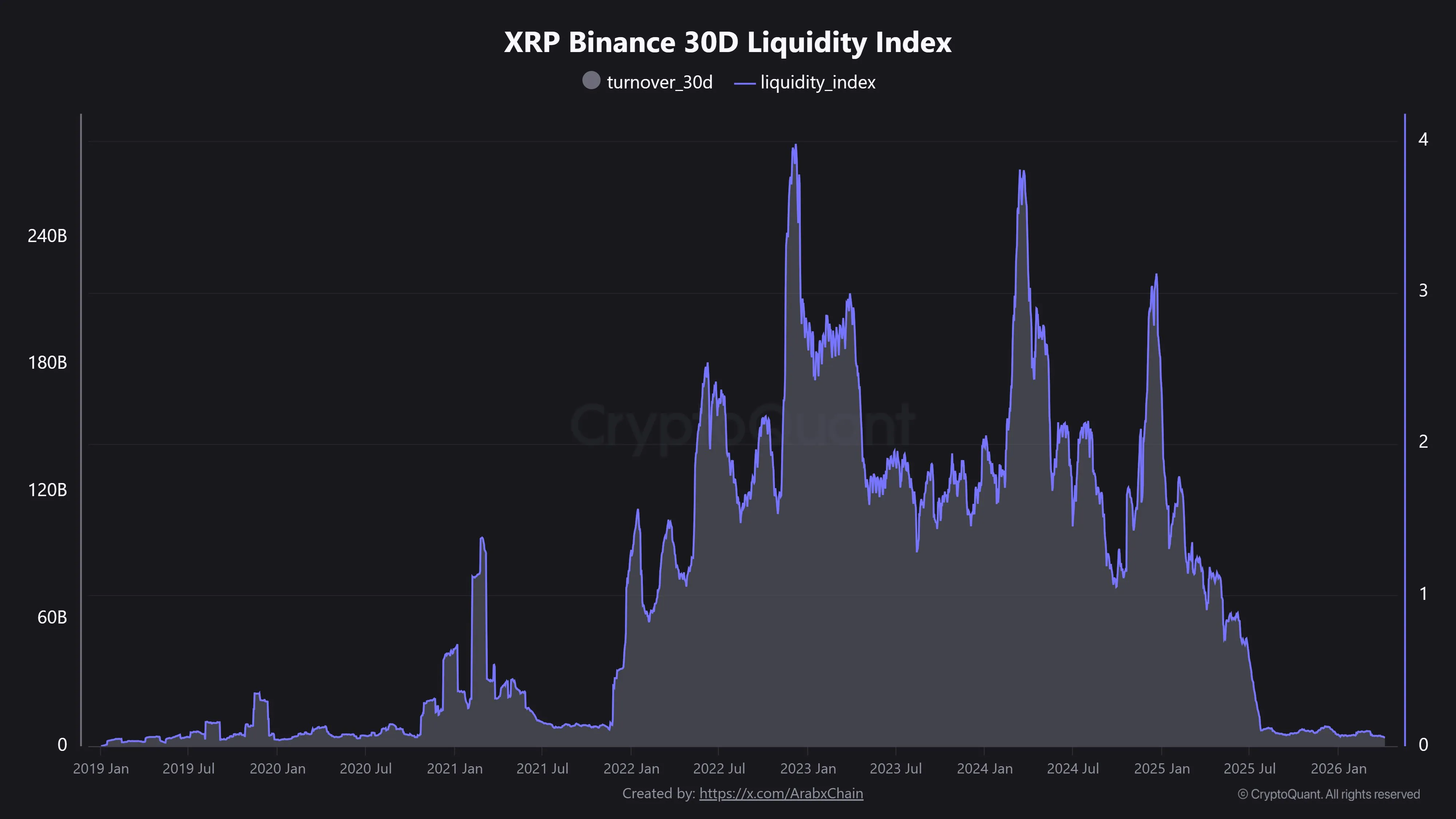 XRP community influencer Arthur stated in a post on X that liquidity for XRP on Binance has virtually collapsed, CryptoPotato reported. He pointed out that the 30-day XRP liquidity index is near an all-time low, and trading volume has plummeted from over $200 billion in January of last year to almost zero. Arthur noted that historically, periods of severely depleted liquidity have often led to increased volatility. He added a bullish perspective, suggesting that with long-term holders refraining from selling, the thin order books on exchanges could trigger a sharp price surge if significant buying pressure materializes.