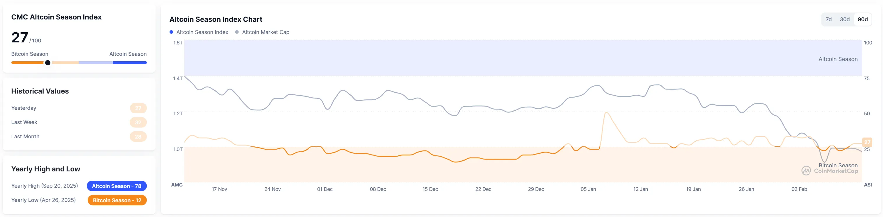 The Altcoin Season Index from comprehensive crypto data platform CoinMarketCap has risen three points from yesterday to 27. The index is calculated by comparing the price performance of the top 100 coins by market capitalization, excluding stablecoins and wrapped tokens, against Bitcoin. If 75% of these top coins outperform Bitcoin over the past 90 days, it is considered an altcoin season. Otherwise, it is deemed a Bitcoin season. A reading closer to 100 indicates an altcoin season.