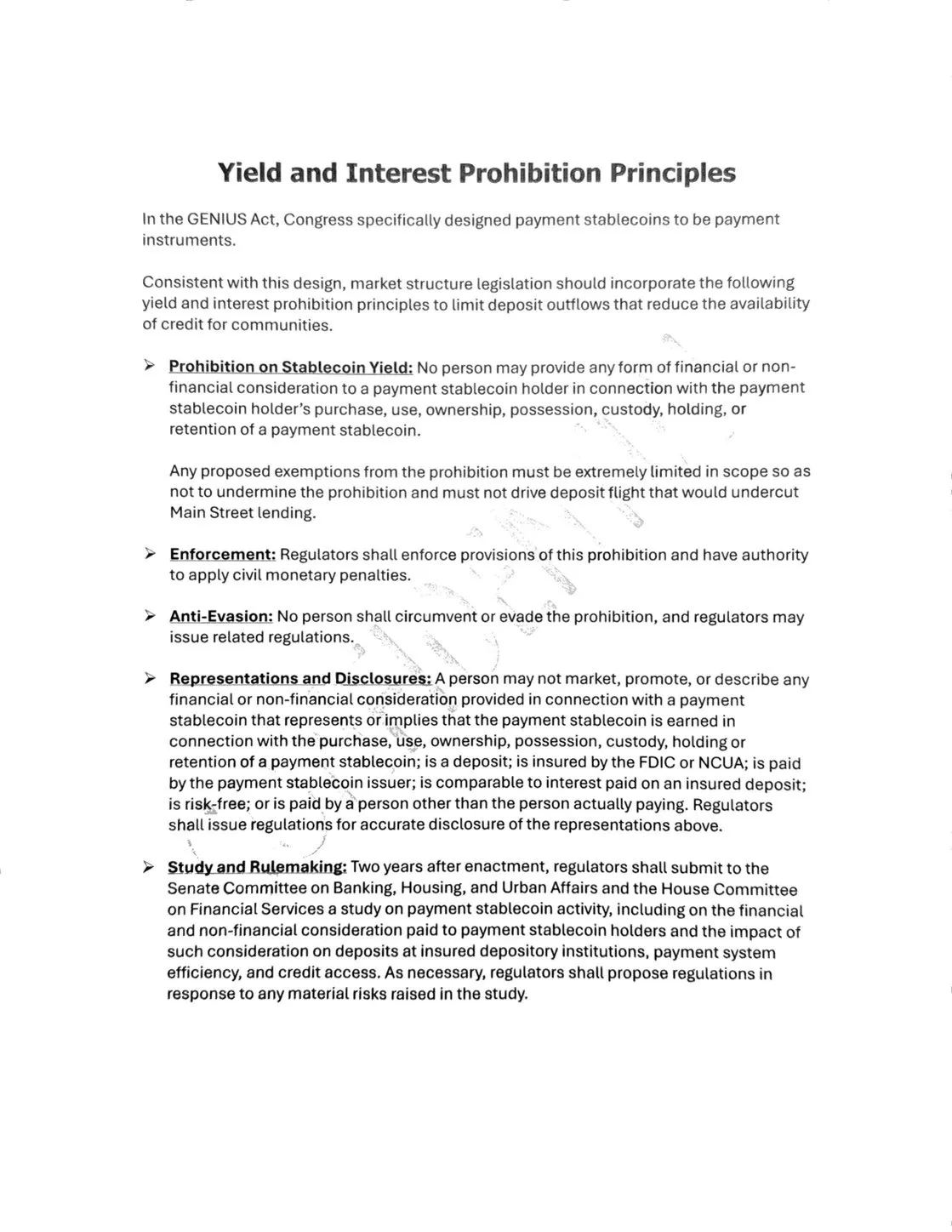 During a second White House meeting convened with banking and crypto industry representatives on stablecoin yields, the banking sector has reportedly proposed a hardline principle that amounts to a total ban on interest payments. According to a White House document shared on X by Decrypt senior reporter Sander Lutz, banking representatives argued for prohibiting any monetary or non-monetary compensation for holding, using, or owning payment stablecoins. They also insisted that any exceptions must be "extremely limited" so as not to undermine the principle of the ban. This stance is even stricter than the latest draft of a market structure bill, which permitted yield payments for certain stablecoin activities. A person familiar with the meeting described the discussion as productive but noted that "nothing was resolved." Future talks are expected to move to the Senate Banking Committee and industry self-regulatory bodies. While some crypto firms are reportedly showing a willingness to accept the banks' demands, Coinbase is said to be maintaining its opposition.