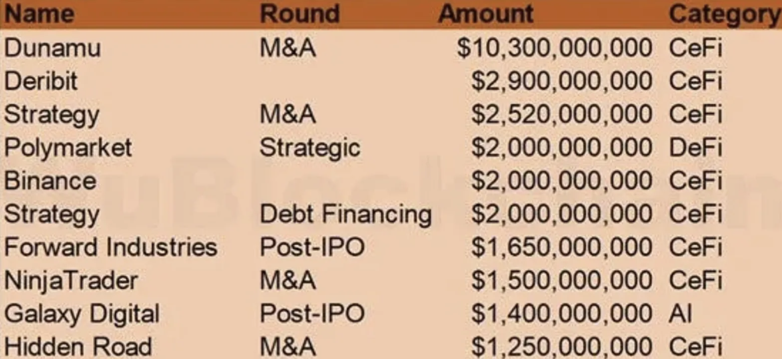 Venture capital investment in the cryptocurrency industry totaled $49.75 billion in 2025, a more than fourfold increase from the previous year, according to data compiled by Wu Blockchain. The surge was largely driven by mergers, acquisitions, and IPOs involving centralized exchanges. The largest single deal was the Dunamu merger, valued at $10.3 billion. Despite the rise in total investment value, the number of deals fell by 42.1% year-over-year to 898.