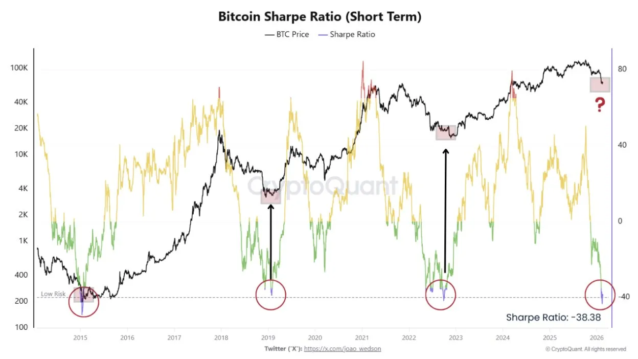 An analysis suggests that Bitcoin is exhibiting a signal previously observed only at major market bottoms. CryptoQuant contributor MorenoDV noted that BTC's short-term Sharpe Ratio, a measure of risk-adjusted returns, has fallen to -38.38. This indicates that losses relative to volatility have reached a maximum.