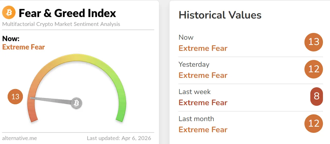 The Crypto Fear & Greed Index, compiled by data provider Alternative, rose one point from yesterday to 13, indicating that the market remains in a state of extreme fear. The index measures market sentiment on a scale of 0 to 100, where 0 represents extreme fear and 100 signifies extreme optimism. It is calculated based on several factors: volatility (25%), trading volume (25%), social media mentions (15%), surveys (15%), Bitcoin's market cap dominance (10%), and Google search volume (10%).