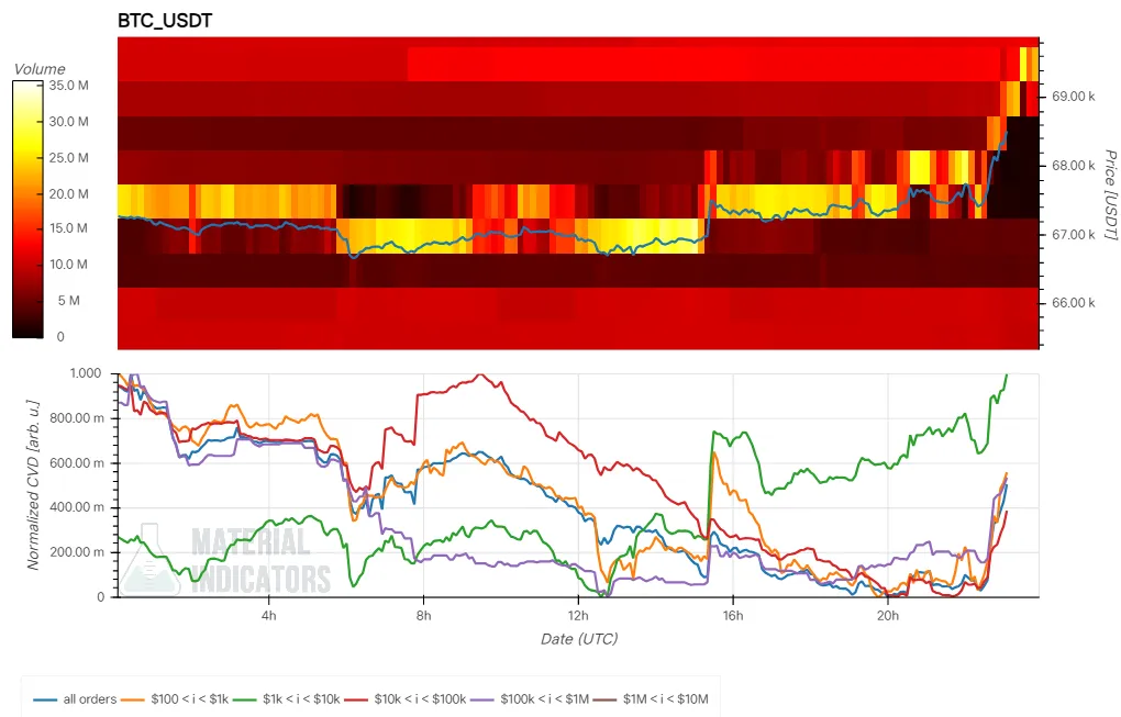 - The bottom Cumulative Volume Delta (CVD) indicator represents buy and sell orders categorized by trade size. As buy orders increase, the corresponding colored line rises. For example, the yellow line tracks orders between $100 and $1,000, while the brown line represents large orders between $1 million and $10 million.