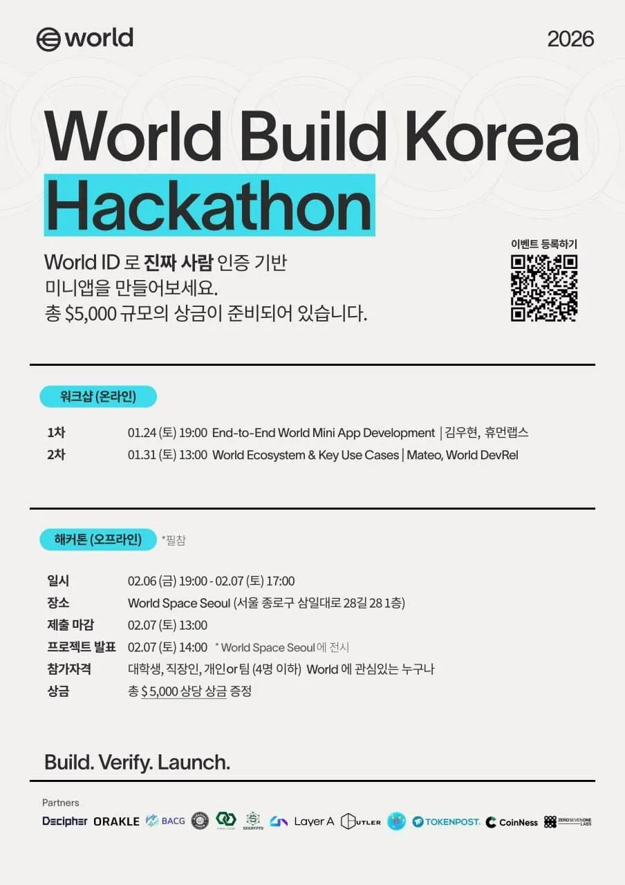 Worldcoin (WLD) is set to host the 2026 World Build Korea Hackathon in Seoul. The event will focus on planning and developing Web3 services that require verification of real human users, as opposed to AI, bots, or Sybil accounts. Participants will use World ID to design and build prototypes of Miniapps accessible only to verified users. Potential application areas include AI, Web3, social platforms, gaming, community tools, and governance. The hackathon offers a total prize pool of $5,000, with top teams gaining networking opportunities and potential for future collaboration within the global Worldcoin ecosystem. The event is supported by several South Korean blockchain societies and communities, including Decipher, Oracle, BADG, Identei, Ewhachain, SKKrypto, Layer-A, and De-Butler. Media partners include HumanLabs, TokenPost, CoinNess, and 071Labs.