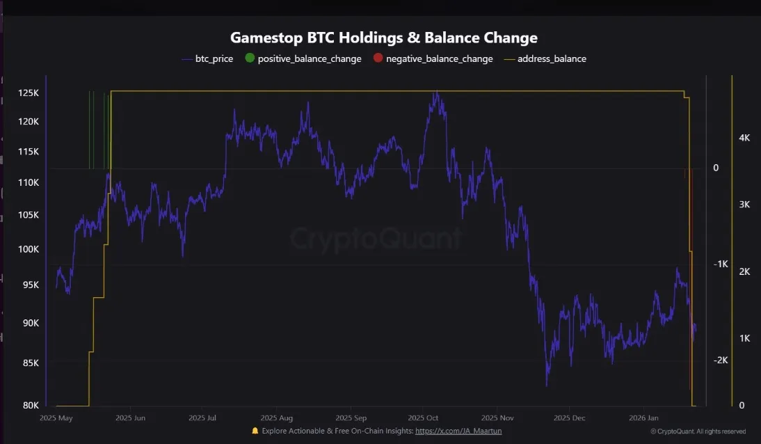 An address believed to belong to U.S. video game retailer GameStop has deposited its entire holding of 4,710 BTC into Coinbase Prime, CryptoQuant reported. The analytics firm suggested the deposit was likely made with the intent to sell. CryptoQuant noted that GameStop originally purchased the 4,710 BTC at an average price of $107,900, meaning a sale would result in an estimated loss of approximately $76 million.