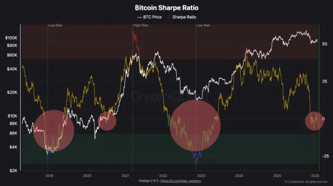 Bitcoin's risk-adjusted returns have deteriorated again, showing signals similar to the 2022 bear market, Coindesk reported, citing data from CryptoQuant. The analysis points to Bitcoin's Sharpe Ratio, a measure of excess return for a given level of risk, which has recently turned negative. This indicates that the cryptocurrency is generating almost no excess returns relative to its risk.