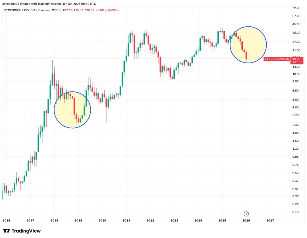 Bitcoin's six consecutive months of underperformance against gold is mirroring a pattern from 2019-2020, according to an analysis by CoinDesk. The outlet noted that the BTC-to-gold ratio has fallen 23% this month alone, indicating that investors have favored the traditional safe-haven asset amid geopolitical uncertainty. This dynamic echoes the period between August 2019 and January 2020, after which Bitcoin went on to outperform gold for the following five months. While some analysts suggest the ratio may have bottomed out, others reportedly express concern that any recovery could be merely a technical rebound.