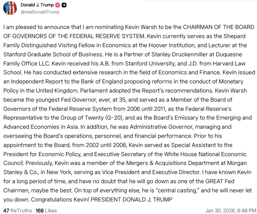 U.S. President Donald Trump has nominated former Federal Reserve Governor Kevin Warsh as the next chair of the central bank, Aggr News reported. In a post on Truth Social, Trump praised Warsh for his extensive research in economics and finance, adding that he would become one of the greatest Fed Chairs in history. While Warsh has traditionally been viewed as a monetary policy hawk, recent assessments suggest he has also shown dovish tendencies. He has consistently emphasized the Federal Reserve's independence and discipline. Within the cryptocurrency market, Warsh has faced criticism for reportedly viewing digital assets as speculative instruments that would disappear with the end of a low-interest-rate environment, while also stressing the importance of real interest rate hikes and reduced liquidity.