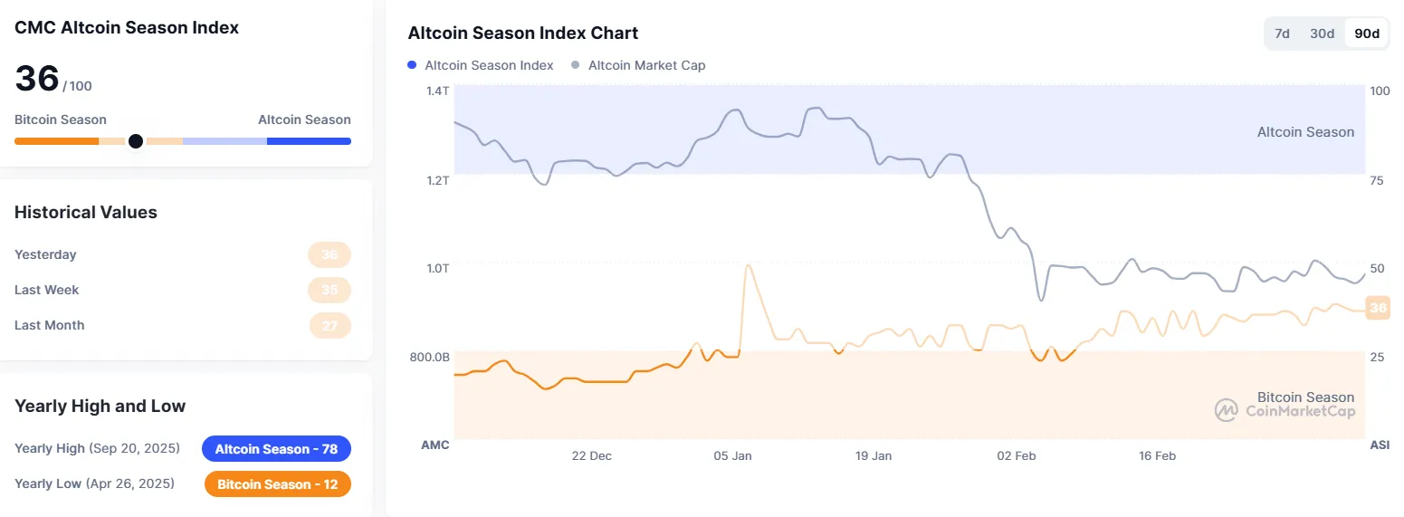 The Altcoin Season Index from crypto data provider CoinMarketCap has fallen one point from yesterday to 36. The index is calculated by comparing the price performance of Bitcoin against the top 100 cryptocurrencies by market capitalization, excluding stablecoins and wrapped tokens, over the past 90 days. It is considered an "altcoin season" if 75% of these top coins outperform Bitcoin during that period; the opposite is considered a "Bitcoin season." A score closer to 100 indicates an altcoin season.