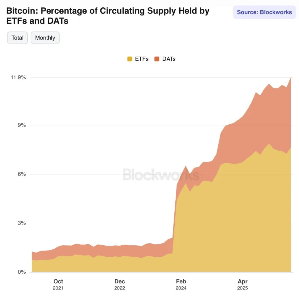 The share of Bitcoin held by ETFs and crypto investment firms (DAT) reached an all-time high in March, approaching 12% of the total circulating supply, Unfolded reported.