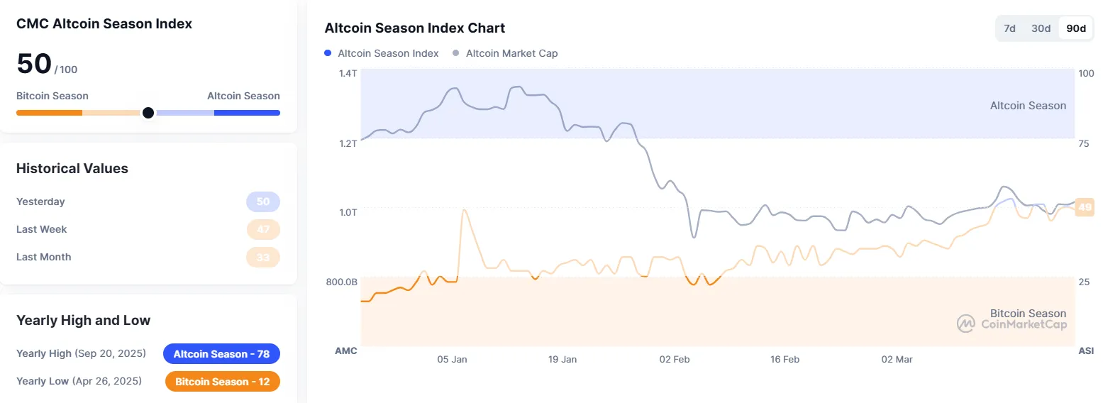 The Altcoin Season Index from crypto data aggregator CoinMarketCap is currently at 50, down one point from yesterday. The index is calculated by comparing the price performance of the top 100 cryptocurrencies by market capitalization, excluding stablecoins and wrapped tokens, against that of Bitcoin. A period is considered an "altcoin season" if 75% of these top 100 coins outperform Bitcoin over the preceding 90 days, while the opposite indicates a "Bitcoin season." A score closer to 100 suggests a stronger trend toward an altcoin season.