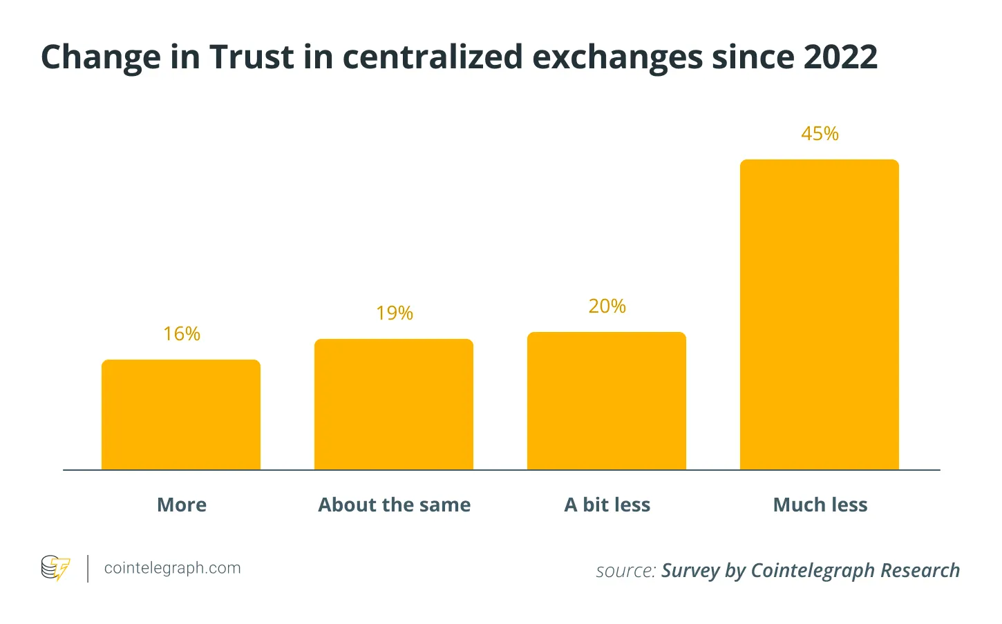 According to a 2025 survey of 375 Cointelegraph readers, 45% of respondents said their trust in centralized exchanges (CEXs) has declined compared to four years ago in 2022. An additional 20% reported a slight decrease in trust, while 19% saw no significant change. Only 16% of those surveyed said their confidence in CEXs had improved. The top three reasons cited for the drop in trust were exchange hacks (33%), the collapse of major platforms like FTX (27%), and regulatory restrictions (26%).