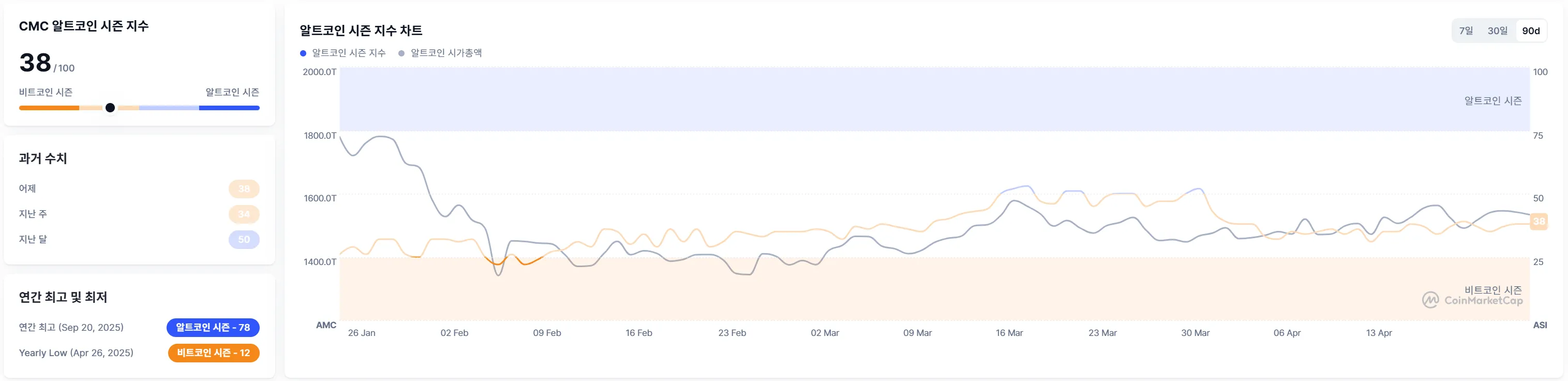The Altcoin Season Index from crypto data platform CoinMarketCap has risen one point from yesterday to 38. The index is calculated by comparing the price performance of the top 100 cryptocurrencies by market capitalization against Bitcoin, excluding stablecoins and wrapped tokens. The metric indicates an altcoin season when 75% of these top 100 coins outperform Bitcoin over a 90-day period. The opposite scenario is considered a Bitcoin season. A score closer to 100 suggests a stronger altcoin season.