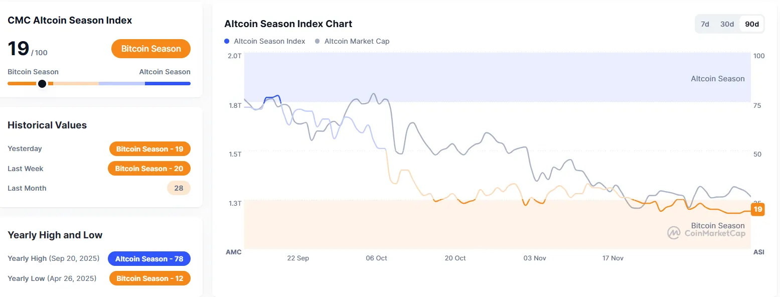 CoinMarketCap's Altcoin Season Index has risen two points from the previous day to 19. The index measures the performance of the top 100 cryptocurrencies by market capitalization, excluding stablecoins and wrapped tokens, against Bitcoin. An "altcoin season" is declared when 75% of these top coins outperform Bitcoin over a 90-day period. A reading closer to 100 indicates a stronger altcoin season.