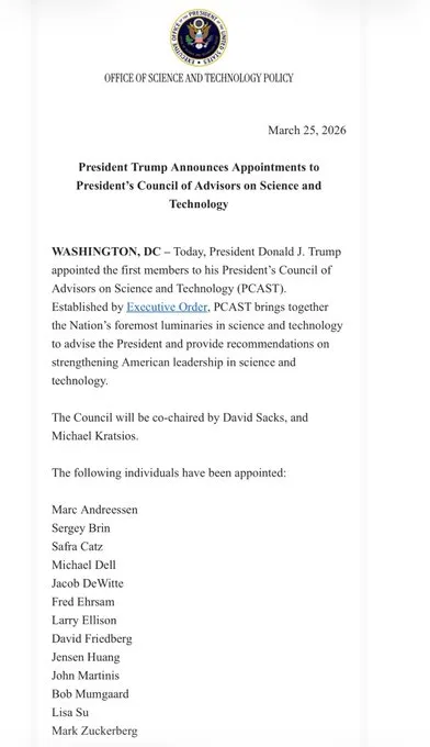 U.S. President Donald Trump's new President's Council of Advisors on Science and Technology (PCAST) includes several cryptocurrency experts, according to a report on X from Eleanor Terrett, host of Crypto in America. The members reportedly include David Sacks, U.S. White House AI and Cryptocurrency Head; Marc Andreessen, founder of Andreessen Horowitz (a16z); and Fred Ehrsam, co-founder of Coinbase.