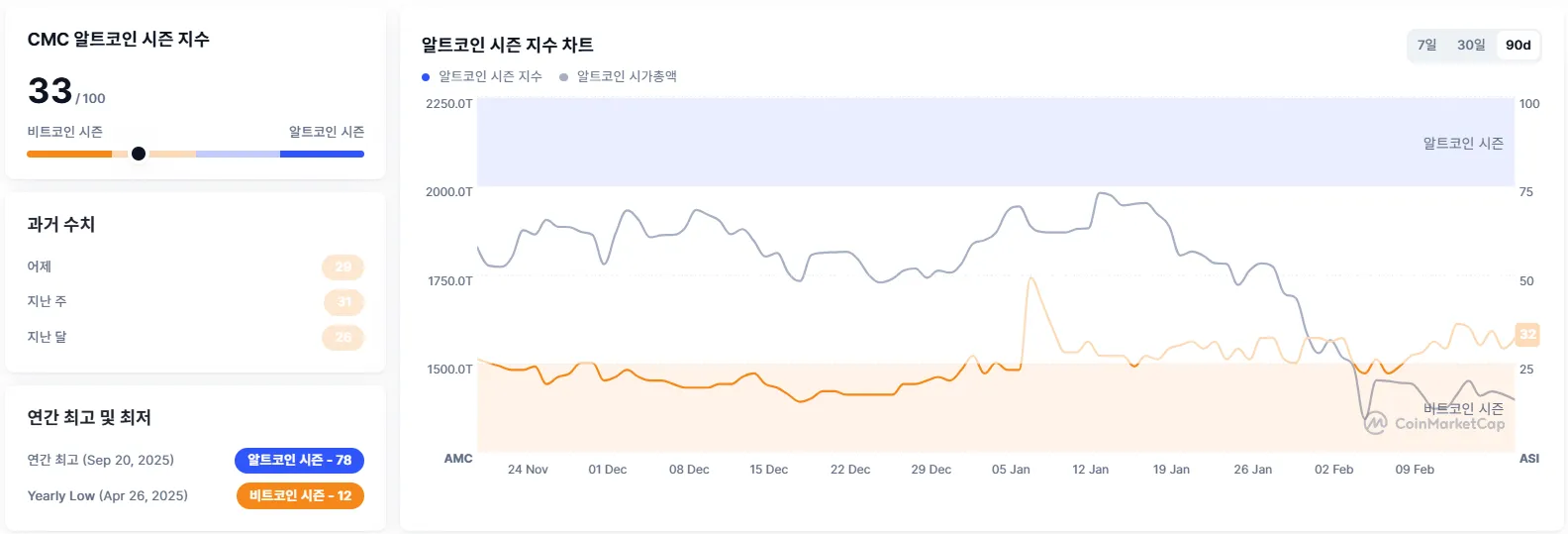 CoinMarketCap's Altcoin Season Index has fallen two points from yesterday to 33. The index is calculated by comparing the price performance of the top 100 coins by market capitalization, excluding stablecoins and wrapped coins, against Bitcoin. The metric signals an altcoin season when 75% of these top coins outperform Bitcoin over a 90-day period. Otherwise, it is considered a bitcoin season. A score closer to 100 indicates an altcoin season.