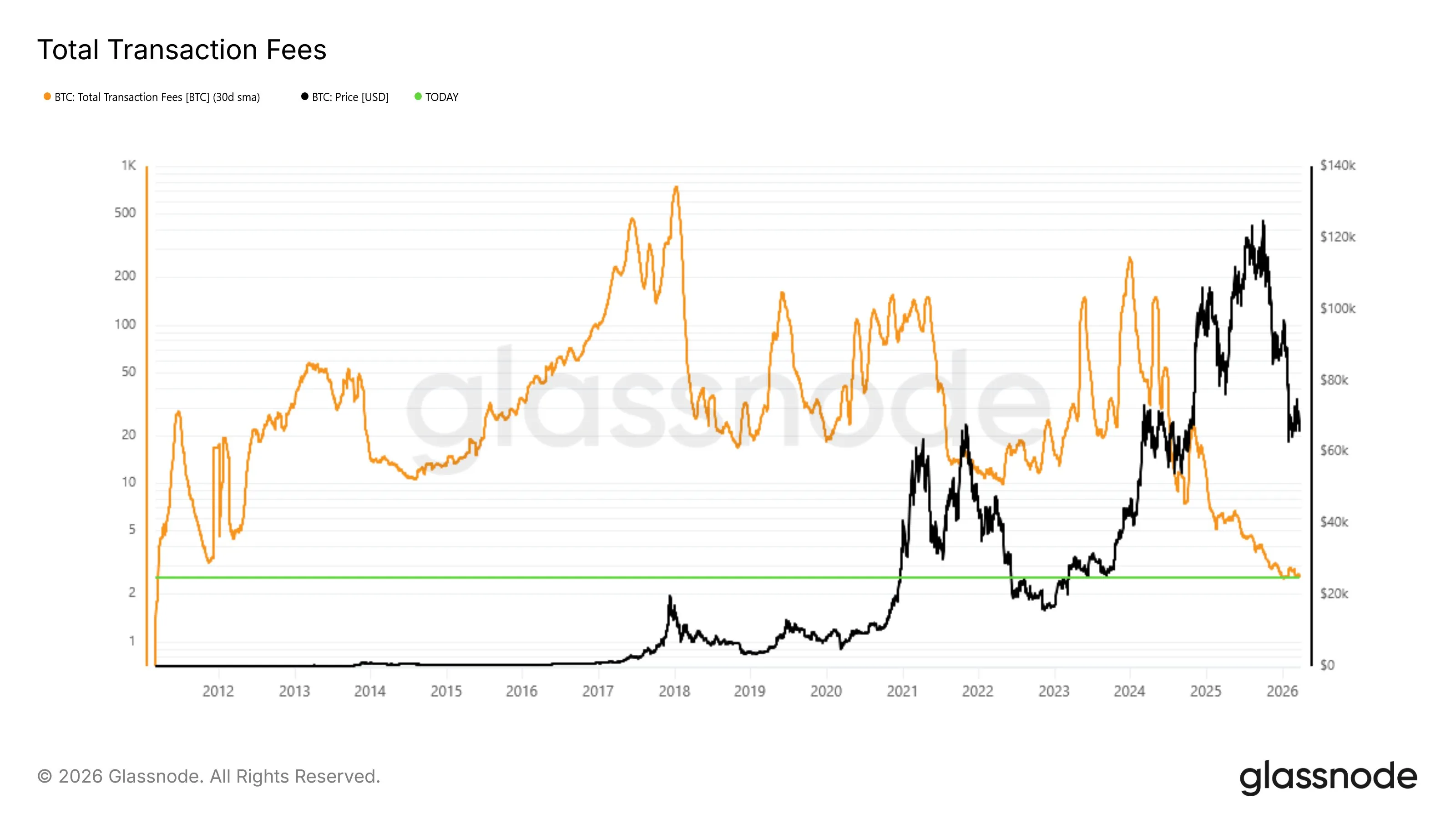 The 30-day simple moving average of total daily transaction fees on the Bitcoin network has dropped to approximately 2.5 BTC, its lowest level since March 2011, according to an analysis by Glassnode. The firm noted that a sharp decline in network fees of this magnitude signifies a clear decrease in on-chain transaction demand and suggests a slowdown in network activity.