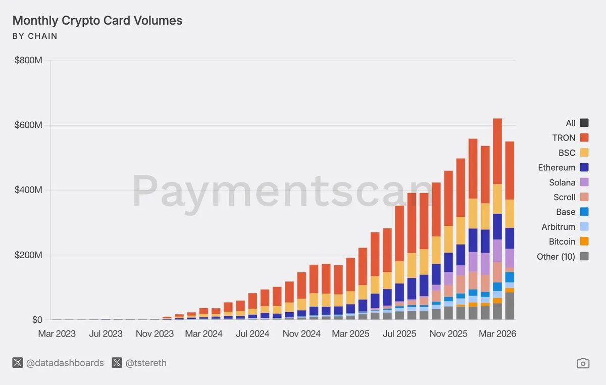 Global cryptocurrency card payment volume has surged 500% since tracking began in September 2024, Solid Intel reported. According to PaymentsScan, recent monthly payment volume has reached approximately $600 million, with payments made via stablecoin-linked cards showing the fastest growth. Visa processes about 90% of all crypto card transactions.
