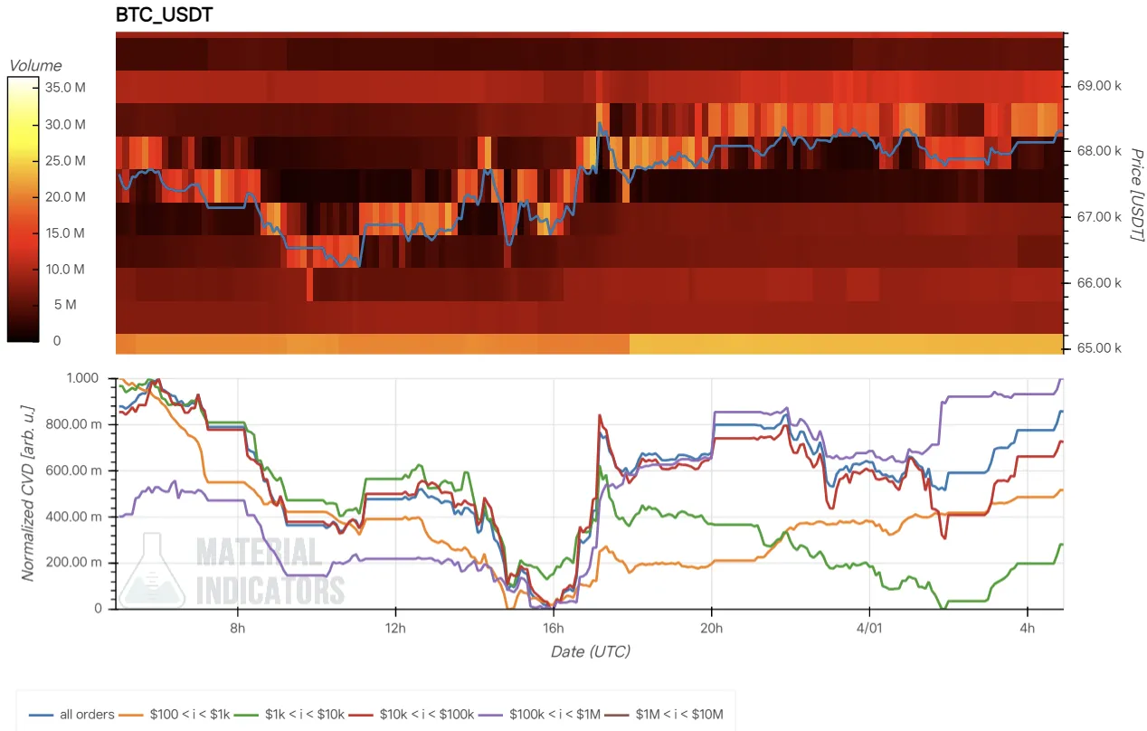 - The Cumulative Volume Delta (CVD) indicator (bottom) shows buy and sell orders categorized by trade size. A rising line indicates an increase in buy orders for that category. For example, the yellow line tracks orders between $100 and $1,000, while the brown line represents large orders between $1 million and $10 million.