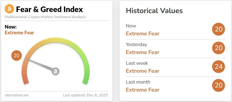 The Crypto Fear & Greed Index from data provider Alternative stands at 20, unchanged from yesterday, maintaining a state of "Extreme Fear." The index measures market sentiment on a scale where 0 indicates extreme fear and 100 represents extreme optimism. It is calculated based on volatility (25%), trading volume (25%), social media mentions (15%), surveys (15%), Bitcoin's market cap dominance (10%), and Google search volume (10%).