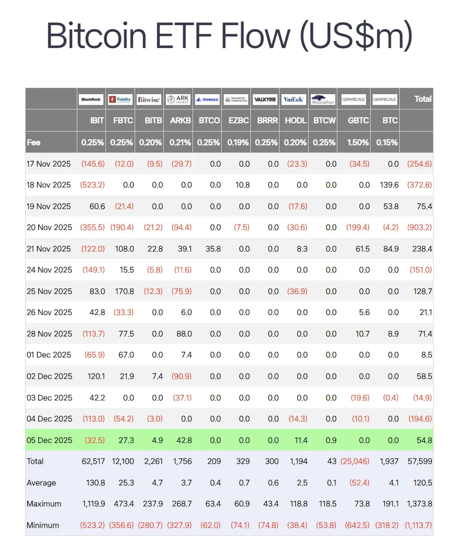 U.S. spot Bitcoin ETFs recorded a total net inflow of $54.8 million on Dec. 5, marking a return to positive flows after two consecutive trading days of net outflows, according to data from Farside Investors. The inflows came despite a $32.5 million net outflow from BlackRock's IBIT. Gains were led by Ark Invest's ARKB, which saw $42.8 million in net inflows, followed by Fidelity's FBTC with $27.3 million, VanEck's HODL with $11.4 million, Bitwise's BITB with $4.9 million, and WisdomTree's BTCW with $900,000. Despite the daily gain, the spot Bitcoin ETF category still posted a cumulative net outflow for the week of Dec. 1-5.