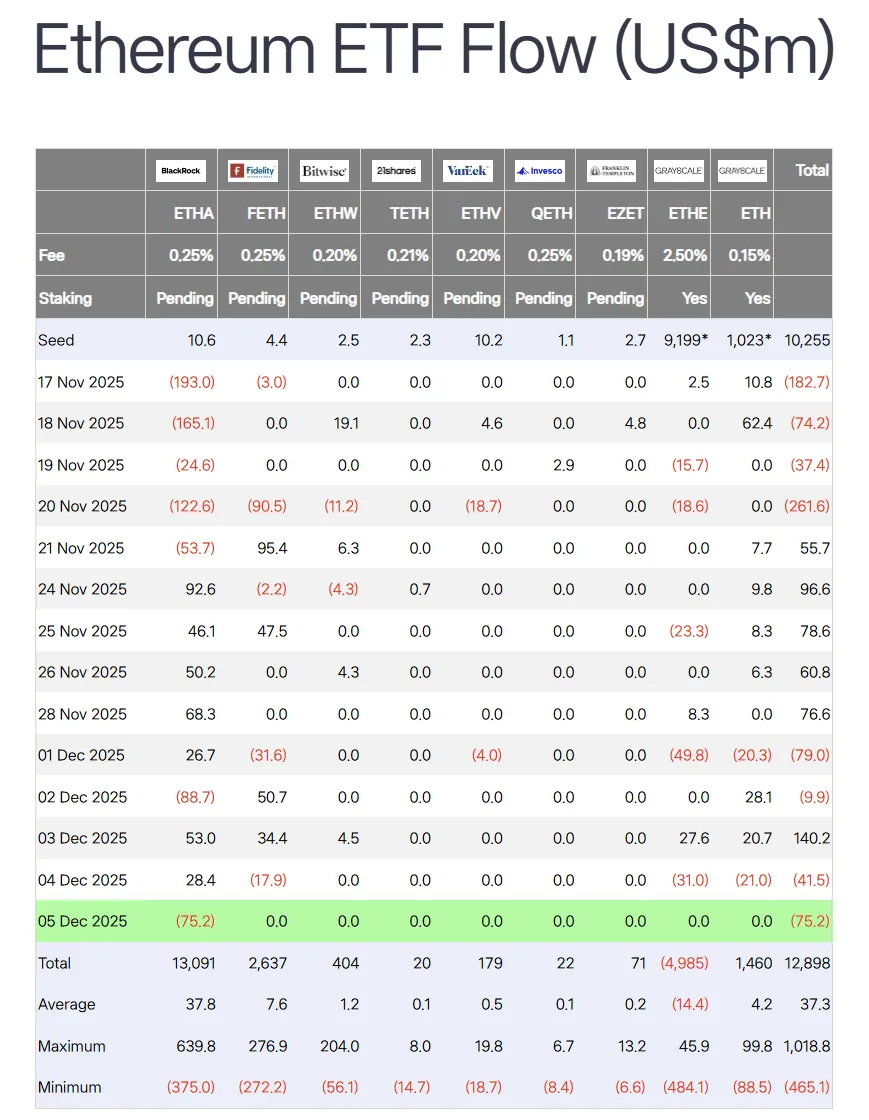 U.S. spot Ethereum ETFs experienced total net outflows of $75.2 million (110.9 billion won) on Dec. 5, marking the second consecutive day of withdrawals, according to data from Farside Investors. BlackRock's ETHA was the only fund to see activity, recording a $75.2 million outflow, while all other ETFs reported no net change in flows. The day's results pushed the cumulative flow for the week of Dec. 1-5 into negative territory.