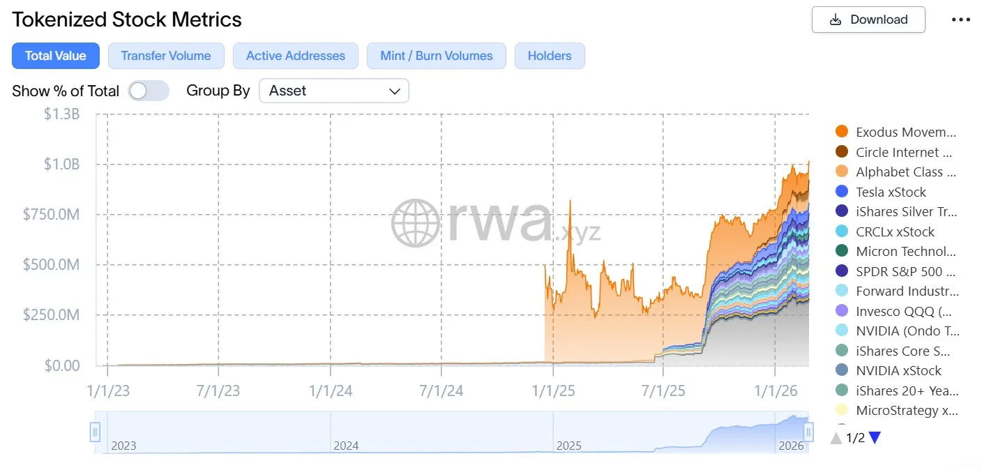 The market capitalization of tokenized stocks has surpassed $1 billion, according to decentralized finance (DeFi) analytics firm Sentora, formerly known as IntoTheBlock. Ondo Finance leads the market with $605 million, followed by xStocks with $232 million.