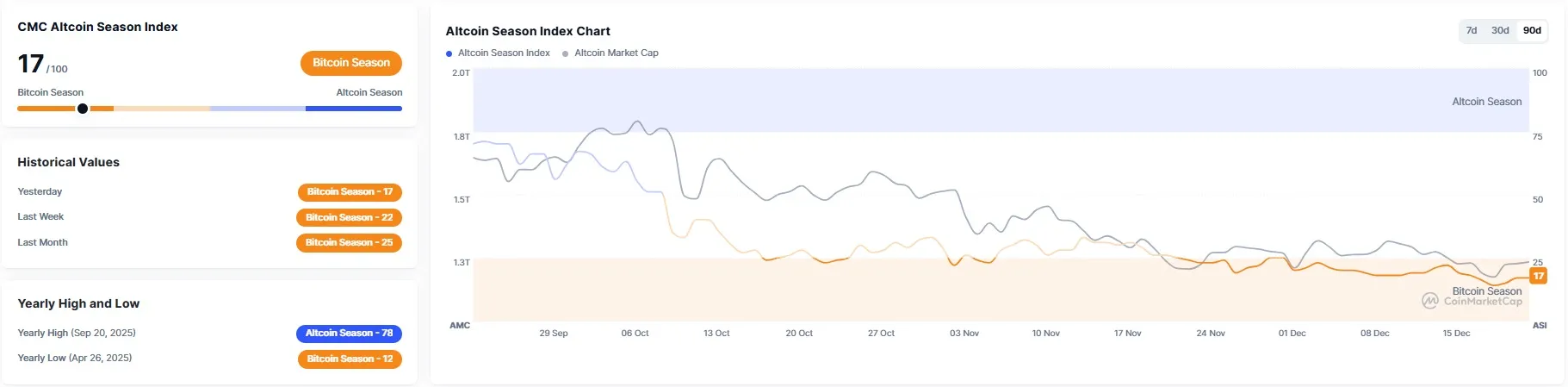 CoinMarketCap's Altcoin Season Index currently stands at 17. The index is calculated by comparing the price performance of the top 100 cryptocurrencies, excluding stablecoins and wrapped tokens, against Bitcoin over the past 90 days. An altcoin season is declared when 75% of these top coins outperform Bitcoin during that period. A score closer to 100 signifies an altcoin season, while the current low reading indicates a Bitcoin season.