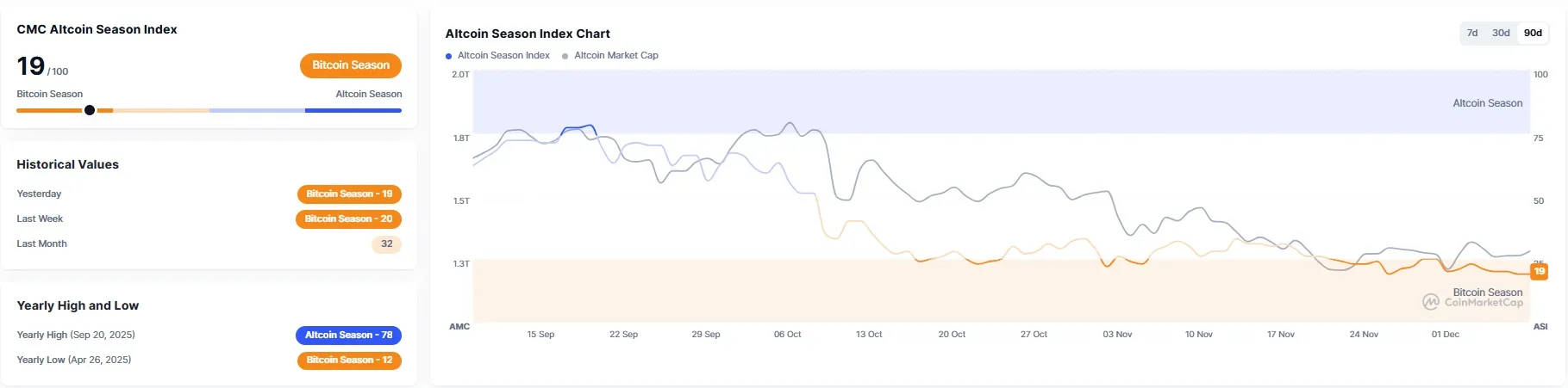 CoinMarketCap's Altcoin Season Index has risen one point from yesterday to 19. The index is calculated by comparing the price performance of the top 100 coins by market capitalization, excluding stablecoins and wrapped coins, against Bitcoin. An "altcoin season" is declared when 75% of these top coins outperform Bitcoin over the past 90 days. A score closer to 100 indicates a stronger altcoin season, while the opposite is considered a "Bitcoin season."