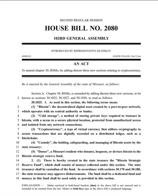 A bill in the U.S. state of Missouri that would create a strategic reserve of Bitcoin (HB2080) has been referred to the House Commerce Committee for review, Cointelegraph reported via its official X account. If the bill passes the committee, it will proceed to a full vote in the House of Representatives. Following that, it would need to be sent to the Senate and signed by the governor to become law. The proposed legislation aims to diversify the state's investment portfolio by establishing a separate fund to purchase or hold Bitcoin. The fund could also acquire Bitcoin using donations from government agencies and residents.