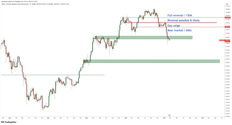 Bitcoin is expected to retest the $60,000 level amid an ongoing crypto market downturn and macroeconomic uncertainty, Bloomberg reported. Caroline Mauron, co-founder of Orbit Markets, stated that the crypto market remains fragile, with participants closely watching the $60,000 support line. She added that macro uncertainties, including tensions in Iran and confusion over U.S. tariffs, are pressuring the market and could trigger a retest of that price. Meanwhile, BTC Markets analyst Rachael Lucas suggested that for Bitcoin to turn bullish, it must first reclaim the $70,000 mark.