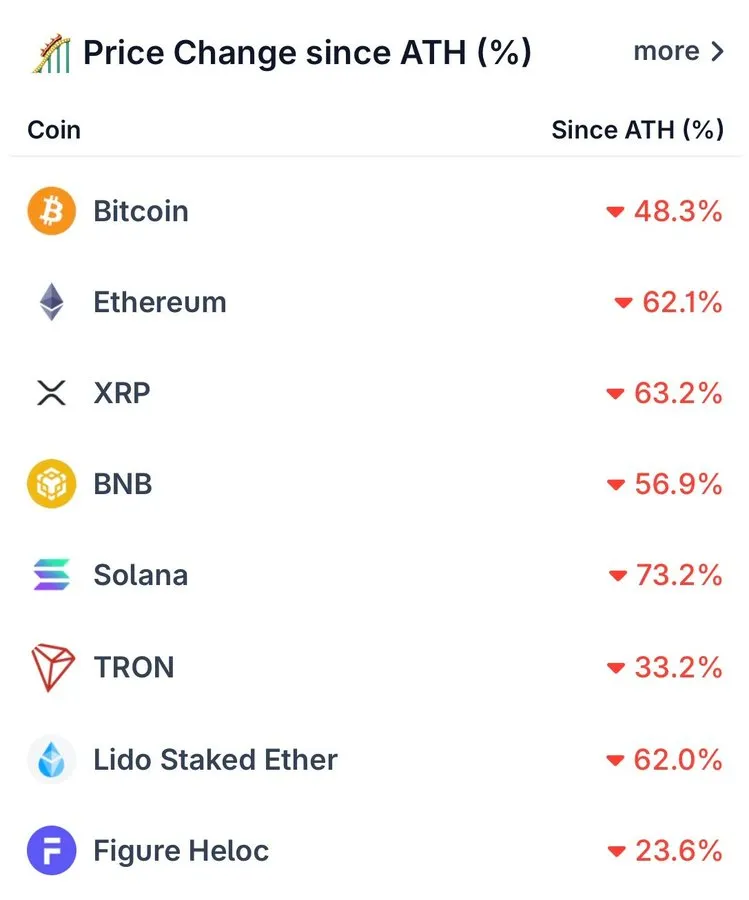 The total cryptocurrency market capitalization has fallen by approximately $100 billion today, CoinGecko reported via its official X account. BTC is currently trading 48.3% below its all-time high, while ETH is down 62.1%, XRP is down 63.2%, BNB is down 56.9%, and SOL is down 73.2%. The total crypto market cap now stands at around $2.2 trillion.