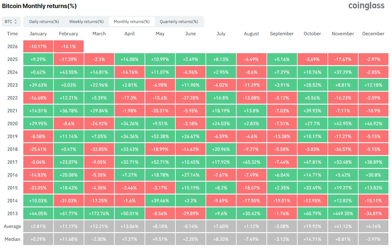 Bitcoin has been declining for five consecutive months since October of last year, according to CoinGlass data. If the current trend holds through the end of the month, it will mark the second-longest losing streak in the cryptocurrency's history. The longest period of consecutive monthly declines was six months, lasting from August 2018 to January 2019.