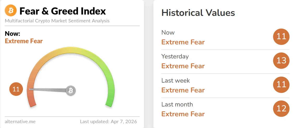 The Crypto Fear & Greed Index, compiled by Alternative, has fallen two points from yesterday to 11, indicating that a state of extreme fear continues to grip the market. The index measures market sentiment on a scale of 0, representing extreme fear, to 100, signifying extreme optimism. Its calculation is based on volatility (25%), trading volume (25%), social media mentions (15%), surveys (15%), Bitcoin's market capitalization dominance (10%), and Google search volume (10%).