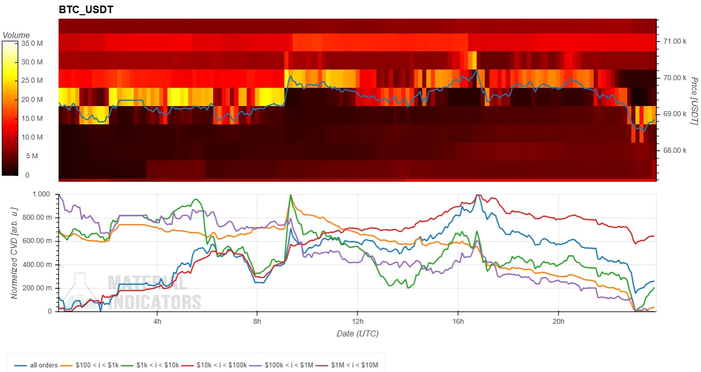 The Spot CVD chart provides an analysis of the BTC/USDT spot pair's order book. The top section shows a Volume Heatmap, and the bottom section displays the Cumulative Volume Delta (CVD). - The Volume Heatmap tracks the volume of trades at specific price levels. The background color brightens when the price lingers in a certain range or moves significantly, with these brighter areas potentially acting as support or resistance levels. - The Cumulative Volume Delta (CVD) indicator represents buy and sell orders categorized by trade size. As buy orders increase, the corresponding colored line rises. For example, the yellow line tracks orders between $100 and $1,000, while the brown line represents large orders between $1 million and $10 million.