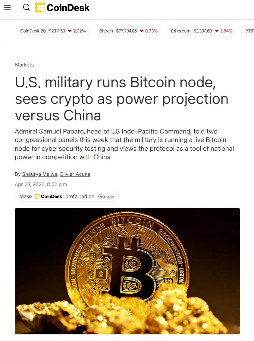 The U.S. Indo-Pacific Command (INDOPACOM) is operating a Bitcoin node for national security and to expand its military influence relative to China, according to Commander Samuel Paparo. Speaking at a U.S. House Armed Services Committee hearing, Paparo stated that the node is not for mining but is used to monitor network activity and conduct various tests, including network security using the Bitcoin protocol, CoinDesk reported. A day earlier, Paparo had also remarked on Bitcoin's potential as a national security tool for the United States. CoinDesk noted the move is highly unusual, as it involves the U.S. military participating in the Bitcoin network, which is designed to resist control by central authorities.
