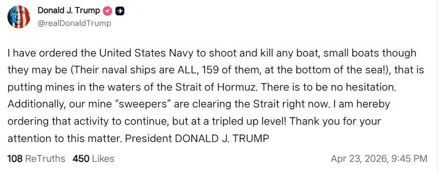 U.S. President Donald Trump announced on Truth Social that he has ordered the Navy to sink all ships, regardless of size, that are laying mines in the Strait of Hormuz. He added that U.S. Navy minesweepers are currently clearing the strait and have already sunk 159 vessels. Trump also stated he will order the operation to continue and be expanded threefold.